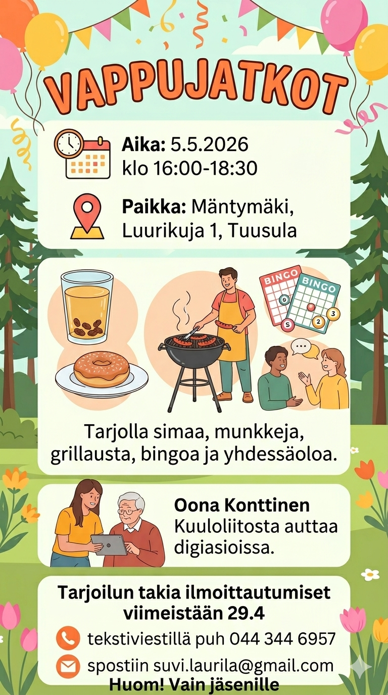 Tarjolla simaa ja munkkeja. Ohjelmassa mm tikanheittoa. Tarjoilun takia ilmoittautumiset viimeistään 29.4 tekstiviestillä puh 044 344 6957 tai spostiin suvi.laurila@gmail.com VAIN JÄSENILLE!